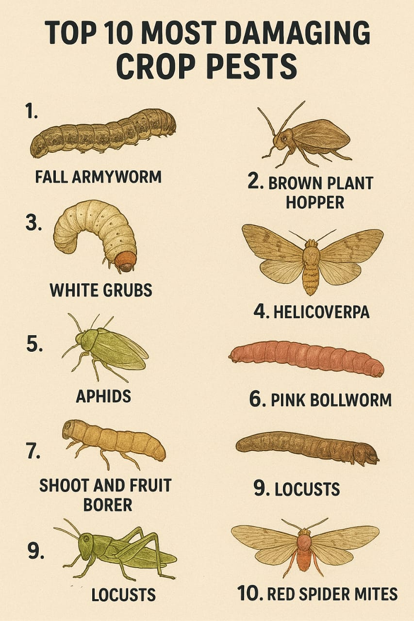 India’s agriculture faces one of its biggest challenges from crop-damaging pests, which cause losses worth thousands of crores annually. From sucking pests to borers, these enemies of farmers reduce yield, damage quality, and sometimes destroy entire crops. Here’s a list of the top 10 most destructive crop pests in...